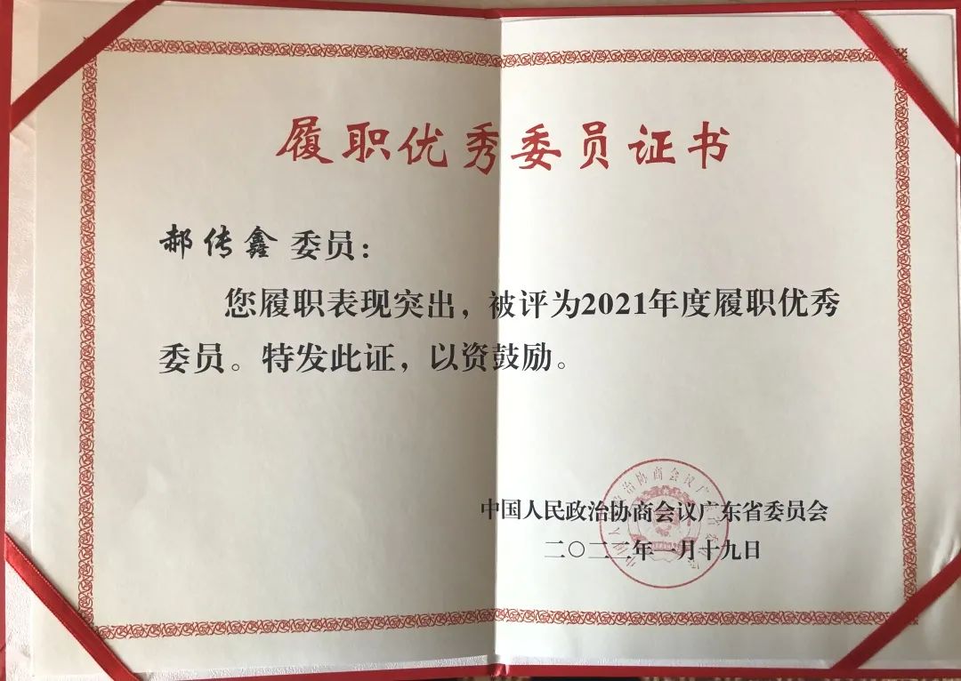 會(huì)上,廣東省政協(xié)對(duì)43件優(yōu)秀提案、21名履職表現(xiàn)突出的委員予以表彰。廣東省新的社會(huì)階層人士聯(lián)合會(huì)副會(huì)長、中華全國專利代理師協(xié)會(huì)副會(huì)長、廣東專利代理協(xié)會(huì)會(huì)長、三環(huán)總經(jīng)理郝傳鑫榮獲政協(xié)廣東省委員會(huì)“2021年度履職優(yōu)秀委員”稱號(hào)。
