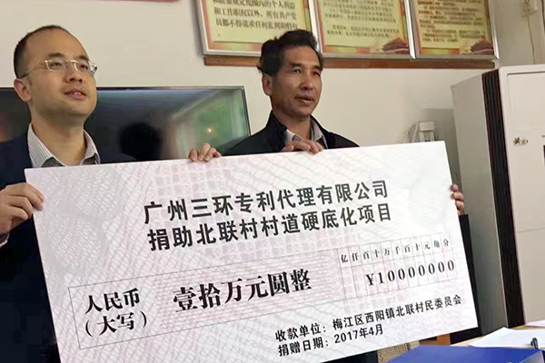 其間還進(jìn)行了三環(huán)捐助北聯(lián)村村道硬底化項(xiàng)目簽字儀式。廣州三環(huán)專(zhuān)利代理有限公司總經(jīng)理郝傳鑫代表三環(huán)出席了該儀式并簽訂捐建協(xié)議,向北聯(lián)村捐出10萬(wàn)元人民幣,用于村道改建工程,助力精準(zhǔn)扶貧工作。